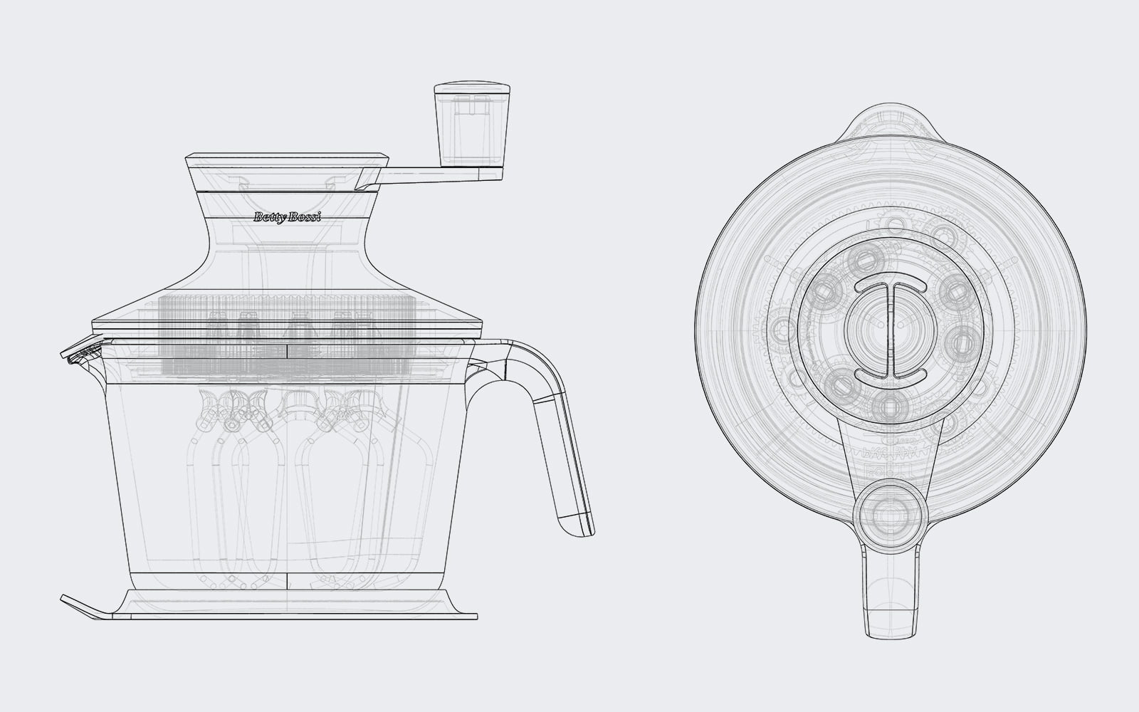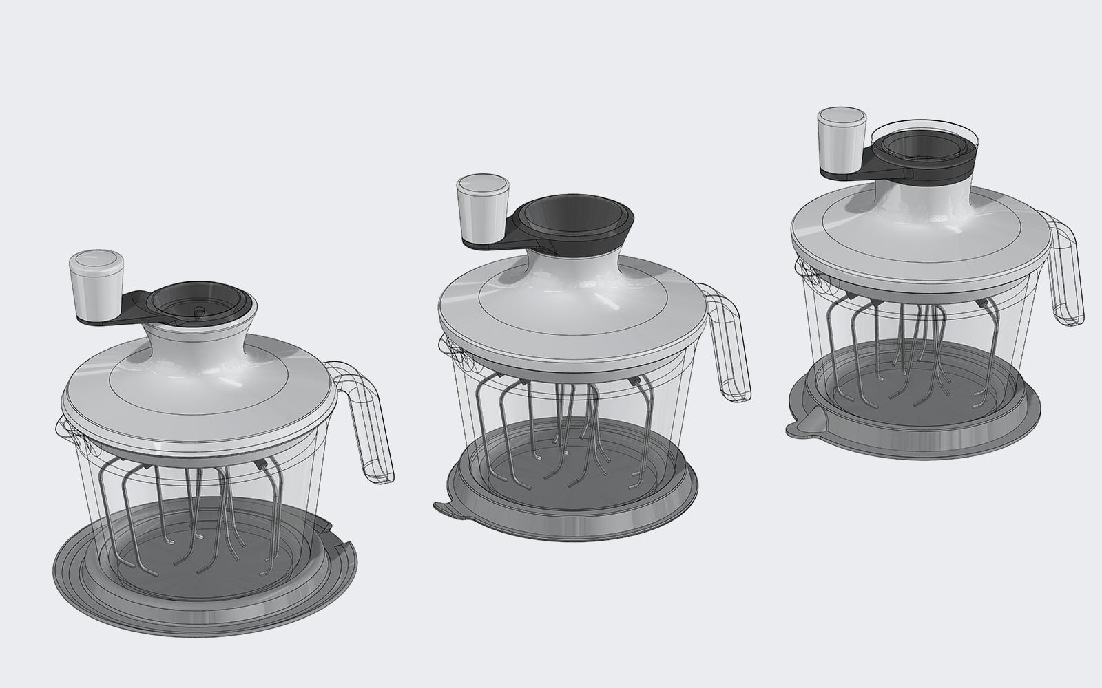 Die Herausforderung bestand darin, das Design des Mischers mit dem Standardgefäss zu vereinen und eine verbesserte Ergonomie zu erreichen. Entstanden ist eine sinnliche und klare Gestaltung. Der beschnittene Volumenkörper schmiegt sich sanft in die Hand und erlaubt beim Arbeiten einen angenehmen Griff. Die verlängerte Kurbel gleitet in Kreisbewegungen über die Haltehand hinweg, und bringt so das Rührwerk ohne grossen Kraftaufwand in Bewegung. Durch die verschiedenen zusätzlichen Einsätze können Eier einfacher getrennt oder Öl dosiert beigemischt werden. Mit dem Küchenblitz lassen sich einfach Eischnee, Schlagrahm, Guss, Saucen oder Mayonnaise in Kürze zubereiten.